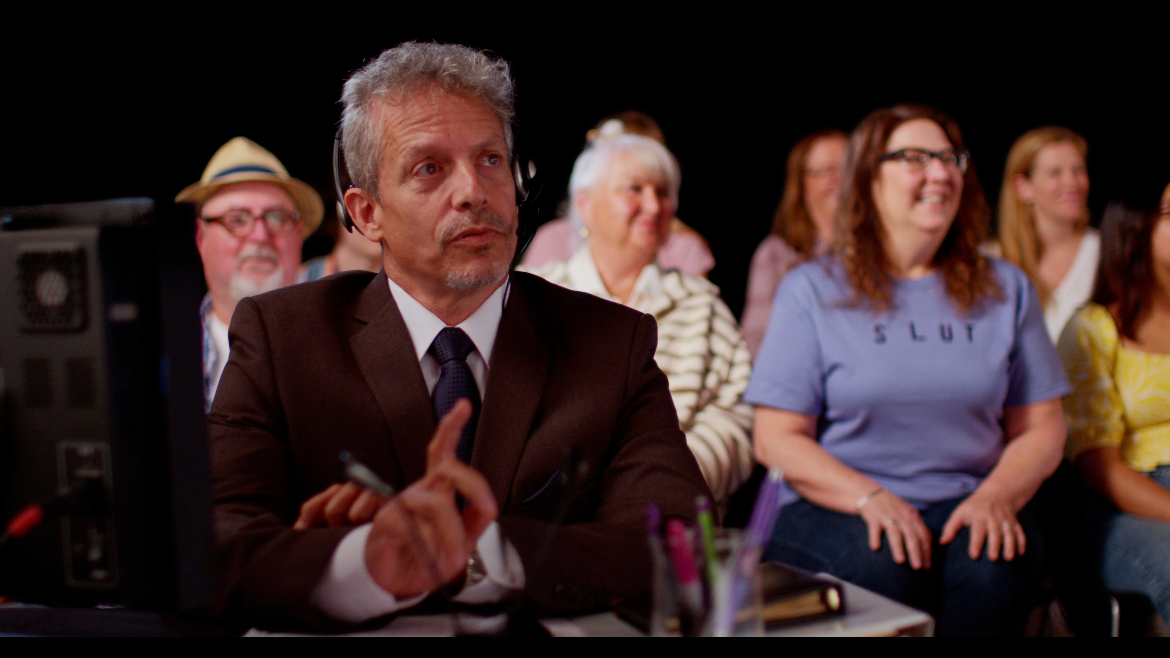A trashy talk show host panics on air as her audience cross-examines her scandalous success.